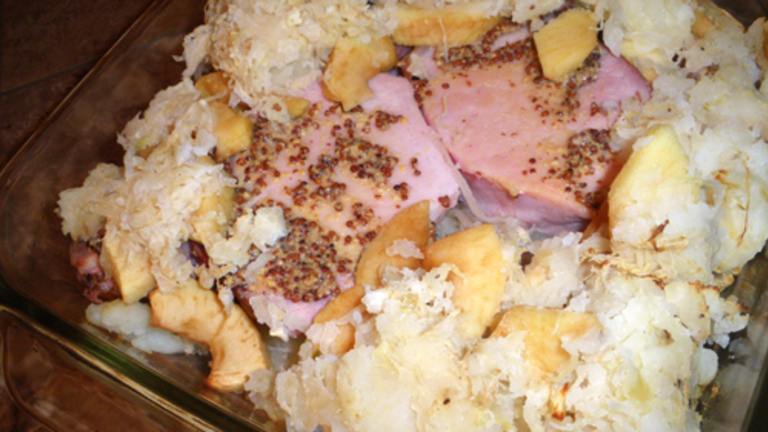 I searched 8 pages of Sauerkraut recipes and not one had smoked pork chops so I made up this recipe and - well not bragging but it tickled our taste buds. Place half the apple sauce in the bottom of the dish. This is not a recipe.